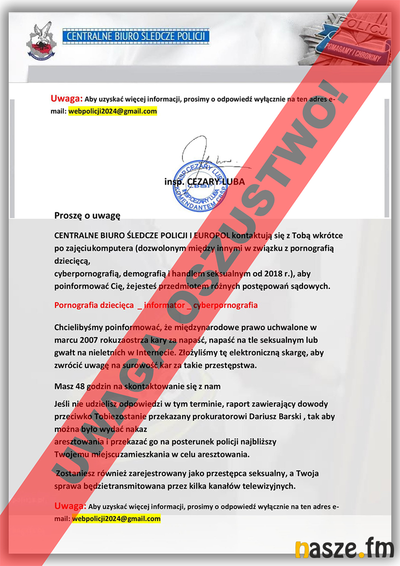 Ponownie odnotowujemy dużą aktywność oszustów, którzy za pomocą poczty e-mail podszywają się pod policjantów Centralnego Biura Śledczego Policji. Zachowajmy szczególną ostrożność, bo przestępcy tylko czekają na nasz błąd!