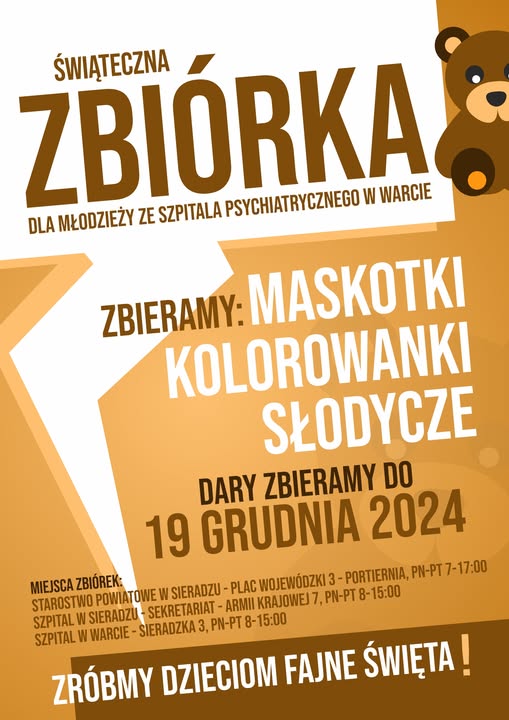 Do 19 grudnia potrwa zbiórka dla dzieci i młodzieży ze Szpitala Psychiatrycznego w Warcie. Jeśli chcecie się włączyć, to organizatorzy czekają na pluszaki, kolorowanki antystresowe i słodycze.