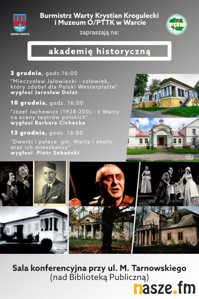 Początek spotkania o godzinie 16. Wykład: "Dworki i pałace gm. Warta i okolic oraz ich mieszkańcy" wygłosi Piotr Sobański. Na Akademię Historyczną zapraszają Burmistrz Warty Krystian Krogulecki i Muzeum O/PTTK w Warcie. Wydarzenie w Bibliotece Publicznej w Warcie. Wstęp wolny.