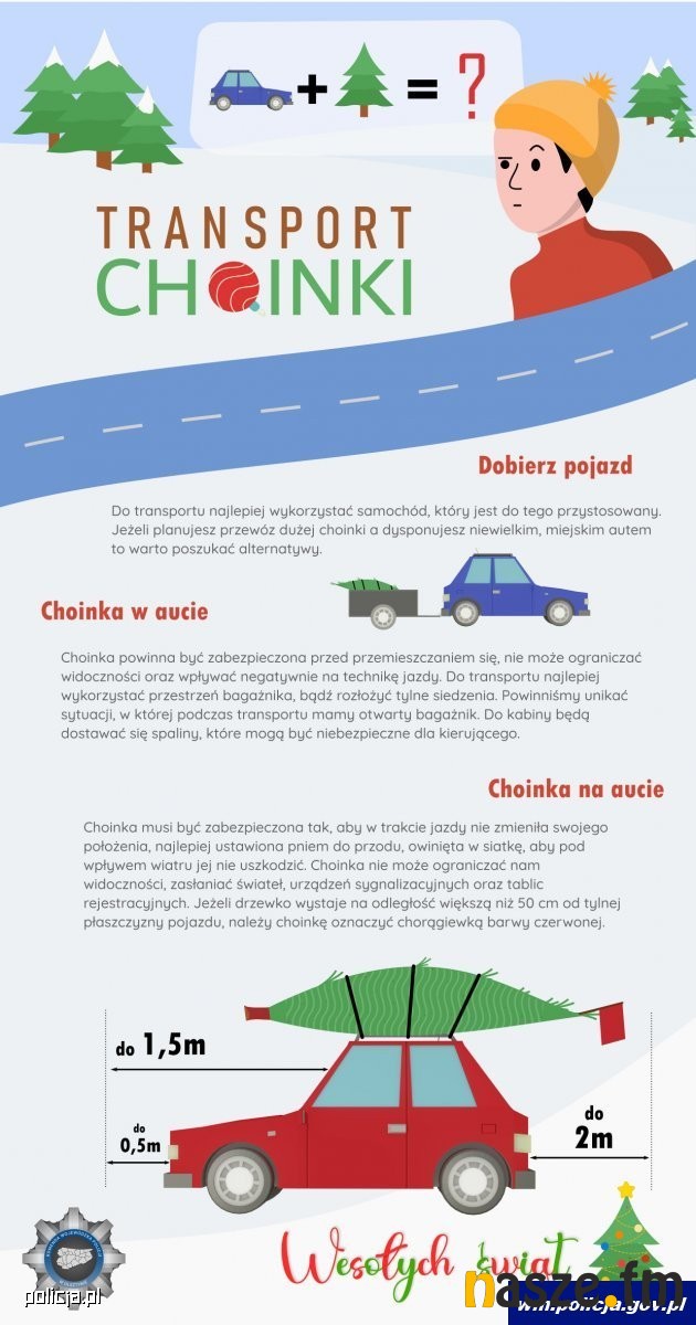 Jeżeli drzewko wystaje na odległość większą niż 50 cm od tylnej płaszczyzny pojazdu, należy choinkę oznaczyć czerwoną chorągiewką. W przypadku, gdy choinka będzie zasłaniać światła pojazdu, możemy zostać ukarani mandatem w wysokości 200 złotych, a gdy zasłoni tablice rejestracyjne - 100 złotych. Jeżeli nieprawidłowo zabezpieczymy choinkę na dachu pojazdu, może być na nas nałożony mandat w kwocie nawet do 3000 złotych. Za nieprawidłowe przewożenie ładunku, przepisy nie przewidują punktów karnych.