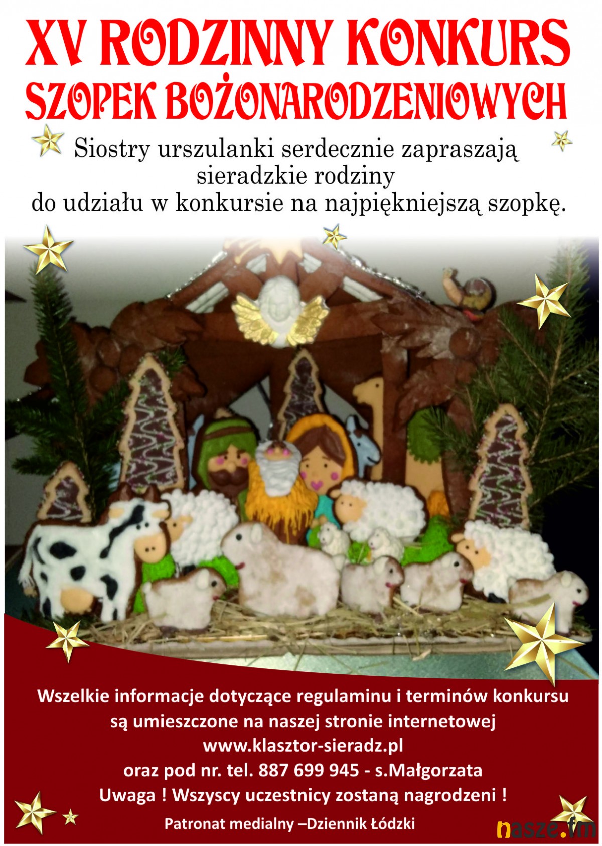 Wystartowała już kolejna edycja Rodzinnego Konkursu Szopek Bożonarodzeniowych. Konkurs na najpiękniejszą szopkę po raz piętnasty organizują Siostry Urszulanki z Sieradza. Prace mogą być wykonane w dowolnej technice, mile widziane nawiązanie do tradycji lokalnej, historii, strojów czy miejscowej architektury. Prace można dostarczać do Klasztoru Sióstr Urszulanek do 23 grudnia.