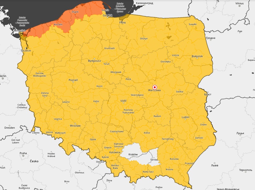 Na mapie poniżej, kolorem żółtym zaznaczono obszar naszego kraju z ostrzeżeniami pierwszego stopnia, pomarańczowym - drugiego.