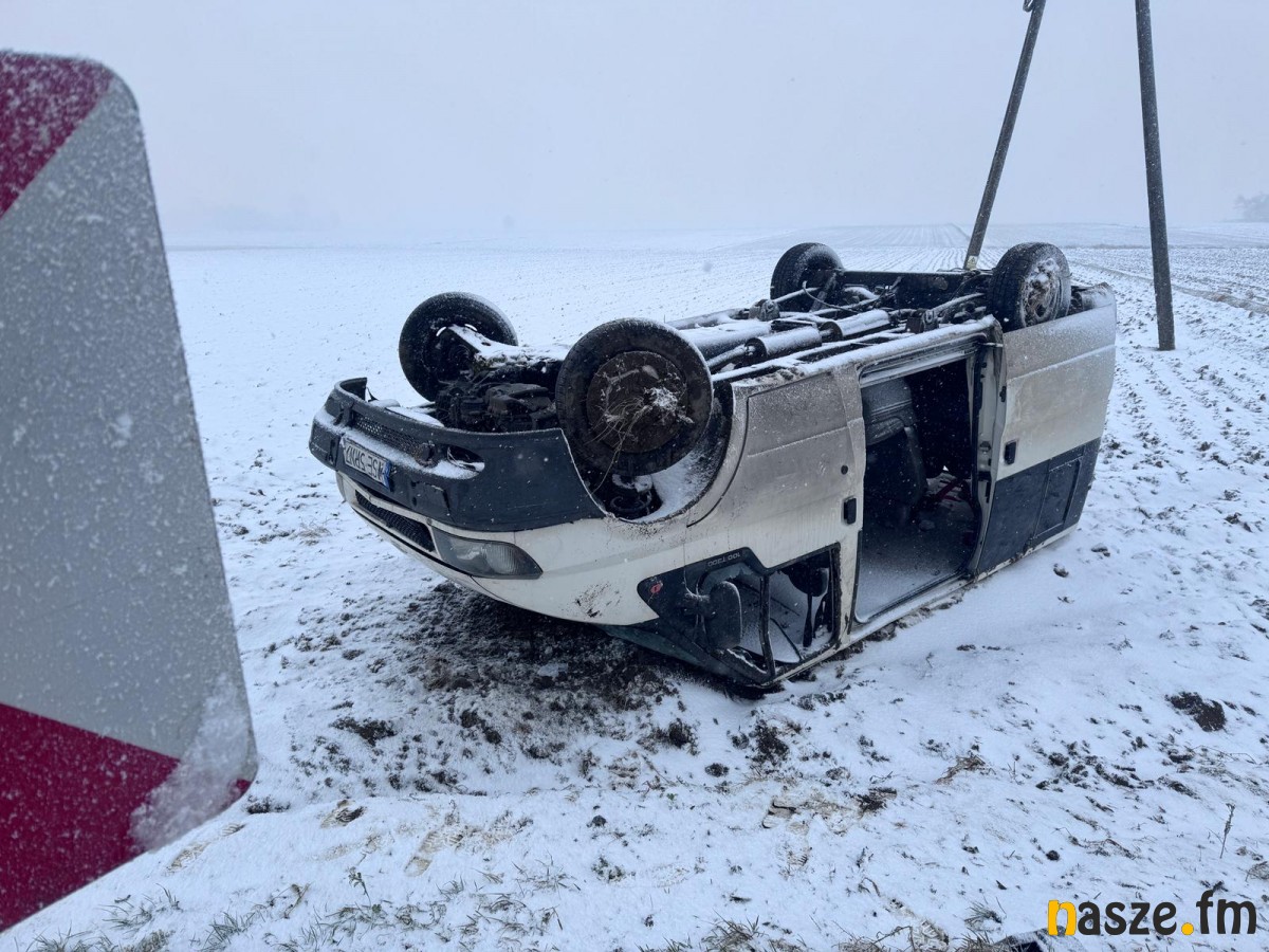 Wczoraj dyżurny policji w Sieradzu otrzymał zgłoszenie o zdarzeniu drogowym w miejscowości Dąbrówka w gminie Wróblew. Jak wynika ze wstępnych ustaleń 34 -letni kierowca busa nie dostosował prędkości o warunków drogowych, stracił panowanie na pojazdem, wpadł w poślizg i dachował.