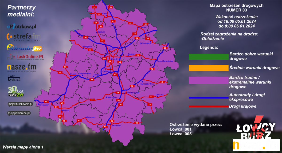 Łowcy Burz Łódzkie ostrzegają przed marznącymi opadami. Będą trudne warunki drogowe, apelujemy o ostrożność. Ostrzeżenie jest aktualne do jutra do godz. 8 rano.