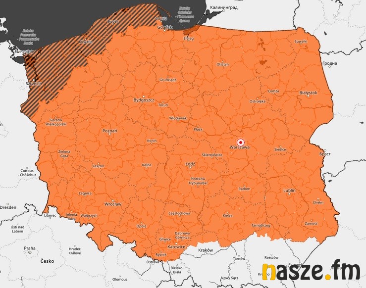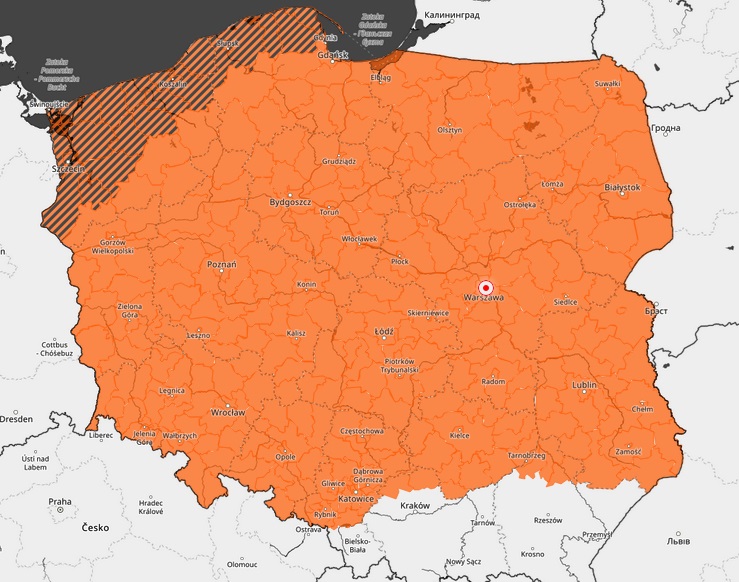 To ostrzeżenie, drugiego, wyższego stopnia. Wydano je dla prawie całego kraju. Obszar objęty tym alertem zaznaczono na mapie poniżej kolorem pomarańczowym. Ostrzeżenie będzie aktualne do środowego poranka.