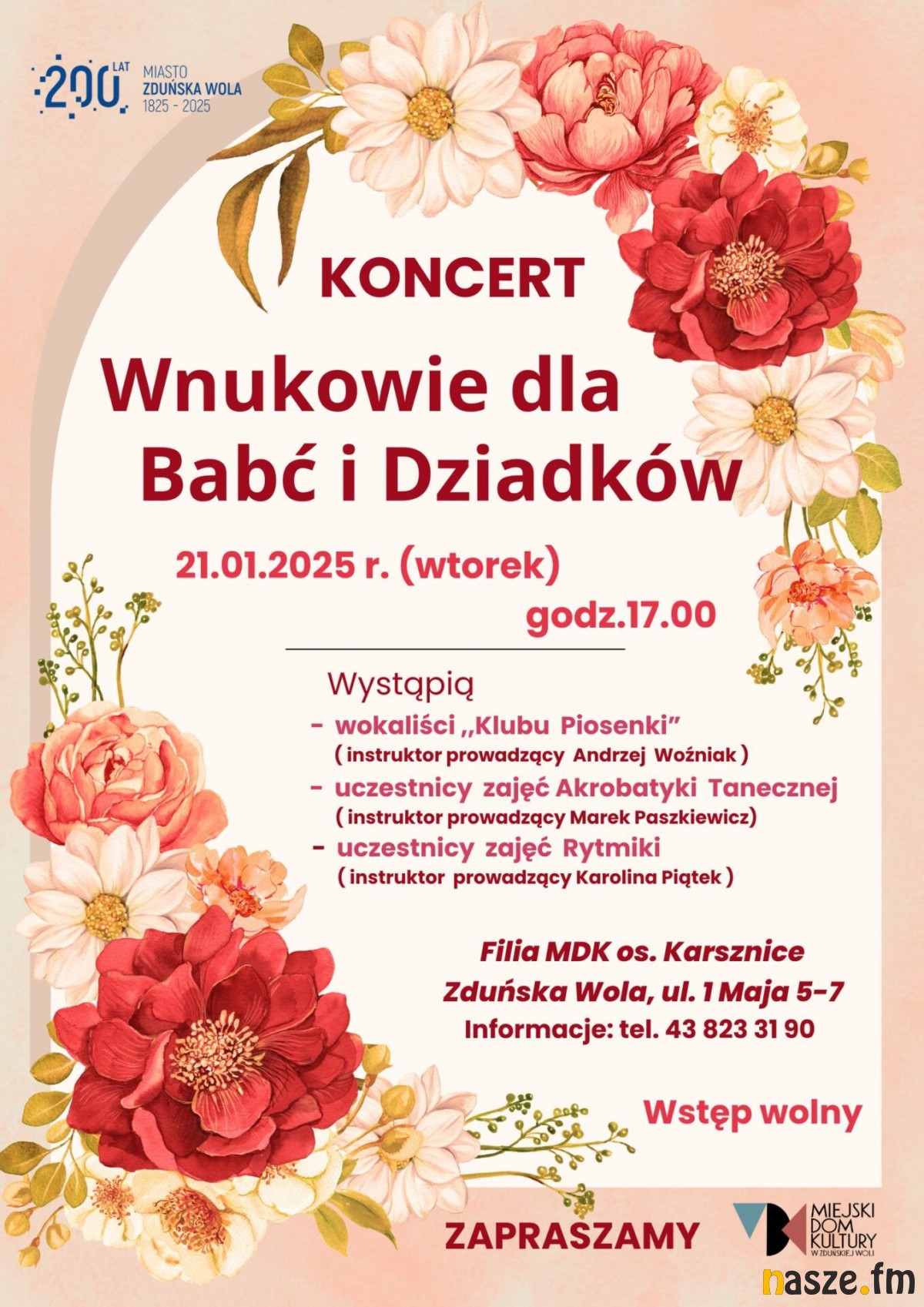 Na wtorek, 21 stycznia, zaplanowano koncert pt: "Wnukowie dla Babć i Dziadków" z udziałem wychowanków filii Miejskiego Domu Kultury os. Karsznice. Na wydarzenie organizatorzy zapraszają Babcie i Dziadków, ale nie tylko.