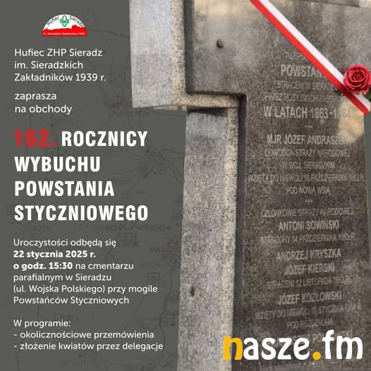 W Sieradzu natomiast uroczystości z okazji 162. rocznicy wybuchu Powstania Styczniowego organizowane przez miejscowy Hufiec ZHP o godz. 15:30 rozpoczną się na cmentarzu parafialnym przy ul. Wojska Polskiego przy mogile Powstańców Styczniowych. W programie okolicznościowe przemówienia i złożenie kwiatów przez delegacje.
