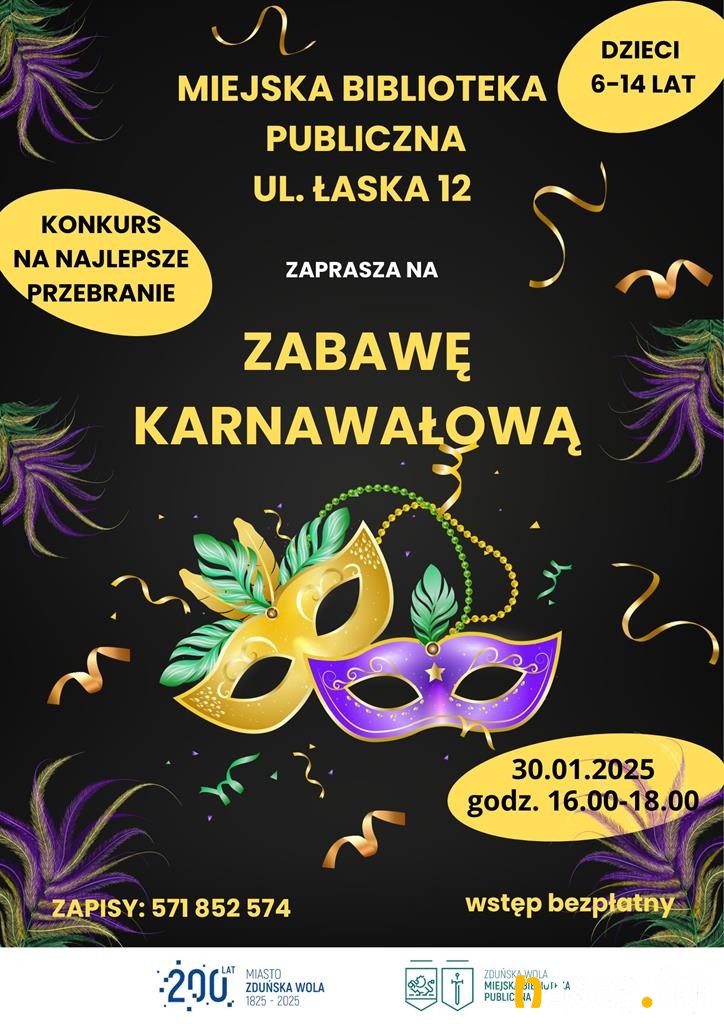 30 stycznia w godzinach 16.00-18.00 wszystkie chętne dzieci w wieku od 6 do 14 lat będą mogły wziąć udział w zabawie karnawałowej, którą organizuje Miejska Biblioteka Publiczna w Zduńskiej Woli. Podczas imprezy odbędzie się konkurs na najlepszy kostium. A przebrać można się za swojego ulubionego bohatera z filmu, książki czy bajki.