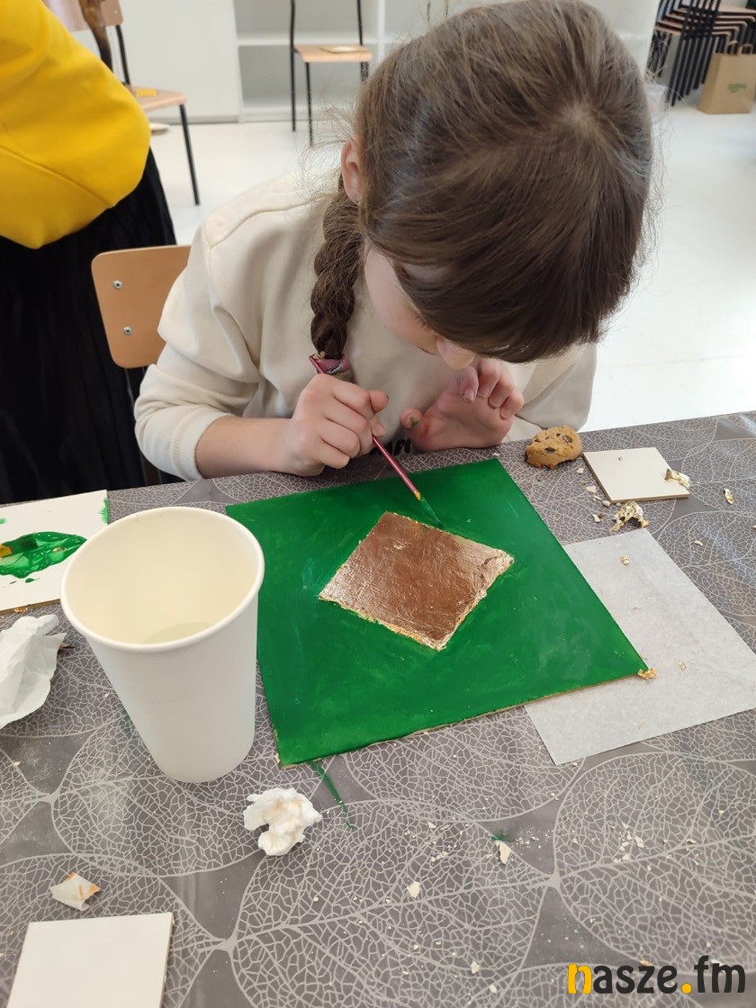 Dzieci najpierw tworzyły małą płaskorzeźbę, którą następnie pozłacały, postarzały i polerowany. Efektem były piękne, mieniące się prace. Warsztaty poprowadził artysta, Michał Śledzinski ze Studia Boza.