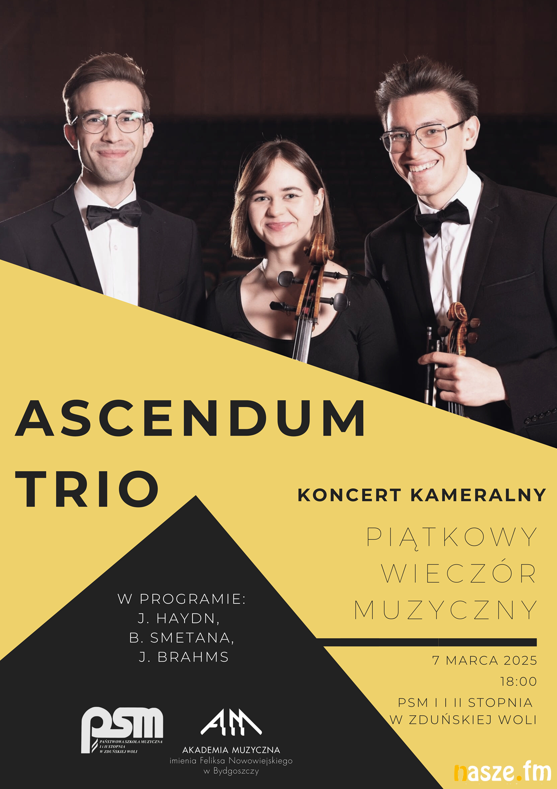 Państwowa Szkoła Muzyczna I i II stopnia w Zduńskiej Woli zaprasza na koncert kameralny z cyklu Piątkowe Wieczory Muzyczne. W piątek, 7 marca, w placówce wystąpi Trio Ascendum z udziałem absolwenta szkoły Piotra Lasoty (skrzypce).