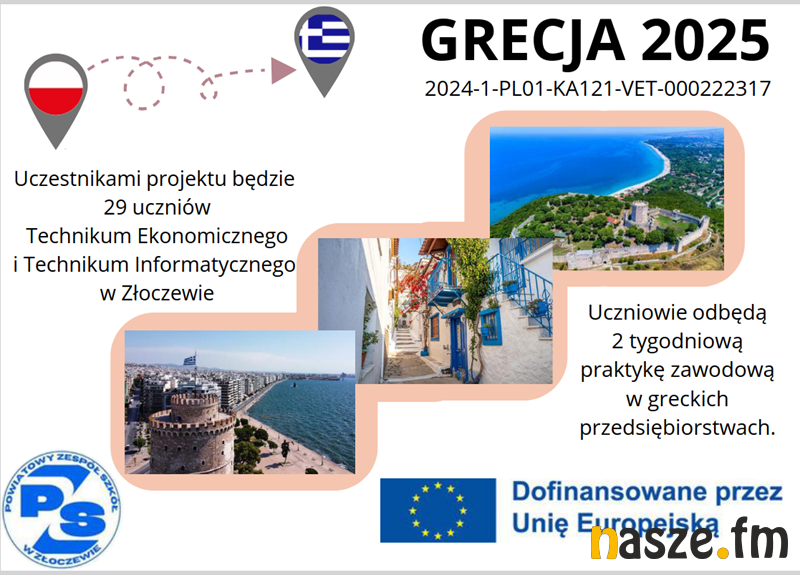 W ramach projektu 14 uczniów Technikum Ekonomicznego, 15 uczniów Technikum Informatycznego wraz z trzema opiekunami, w dniach od 12.05.2025 do 23.05.2025 roku przebywać będzie na praktykach zawodowych w Grecji.