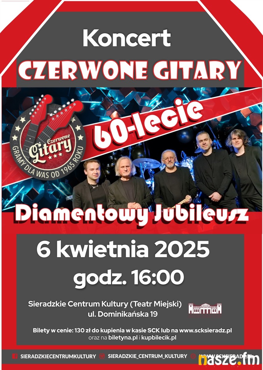 Koncert rozpocznie się o godz. 18:00. W kasie Sieradzkiego Centrum Kultury zostały ostatnie bilety na to wydarzenie. Od dawna nie ma ich już na niedzielny koncert Czerwonych Gitar. Zespół wystąpi w ramach diamentowej trasy koncertowej z okazji 60-lecia. Ten koncert zaplanowano na godz. 16:00.