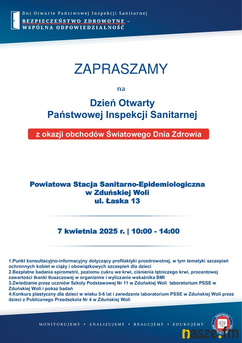 Z inicjatywy Głównego Inspektora Sanitarnego w dniach 5 - 11 kwietnia 2025 roku w całym kraju będą organizowane Dni Otwarte w placówkach Państwowej Inspekcji Sanitarnej pod hasłem "Bezpieczeństwo zdrowotne - wspólna odpowiedzialność". Dziś, 7 kwietnia, na Dzień Otwarty zaprasza Powiatowa Stacja Sanitarno-Epidemiologiczna w Zduńskiej Woli. Będzie to okazja m.in. do skorzystania z darmowych badań.