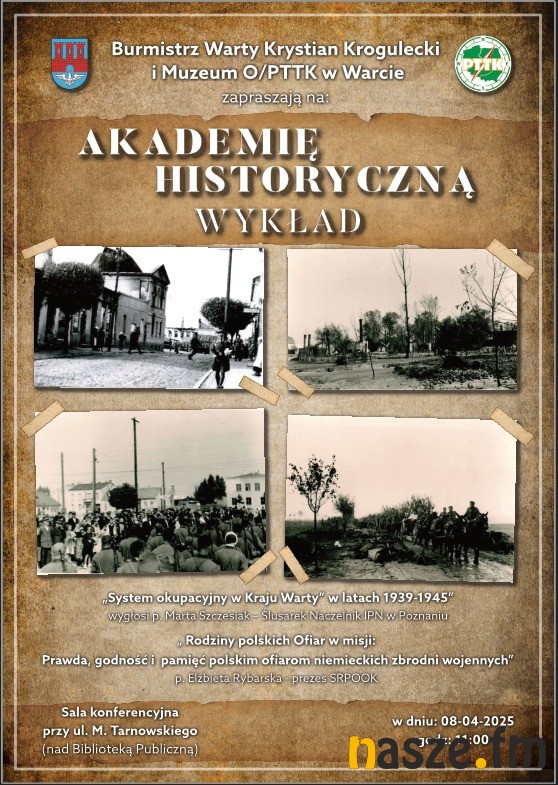 Na Akademię zapraszają Burmistrz Warty Krystian Krogulecki oraz Muzeum O/PTTK w Warcie. Gośćmi będą: Naczelnik IPN w Poznaniu Marta Szcześak-Ślusarek, która wygłosi wykład połączony z prezentacją na temat "System okupacyjny w Kraju Warty" w lalach 1939-45", a prezes Stowarzyszenia Polskich Rodzin Ofiar Obozów koncentracyjnych Elżbieta Rybarska przedstawi temat; "Rodziny polskich ofiar w misji; prawda, godność i pamięć polskim ofiarom niemieckich zbrodni wojennych".