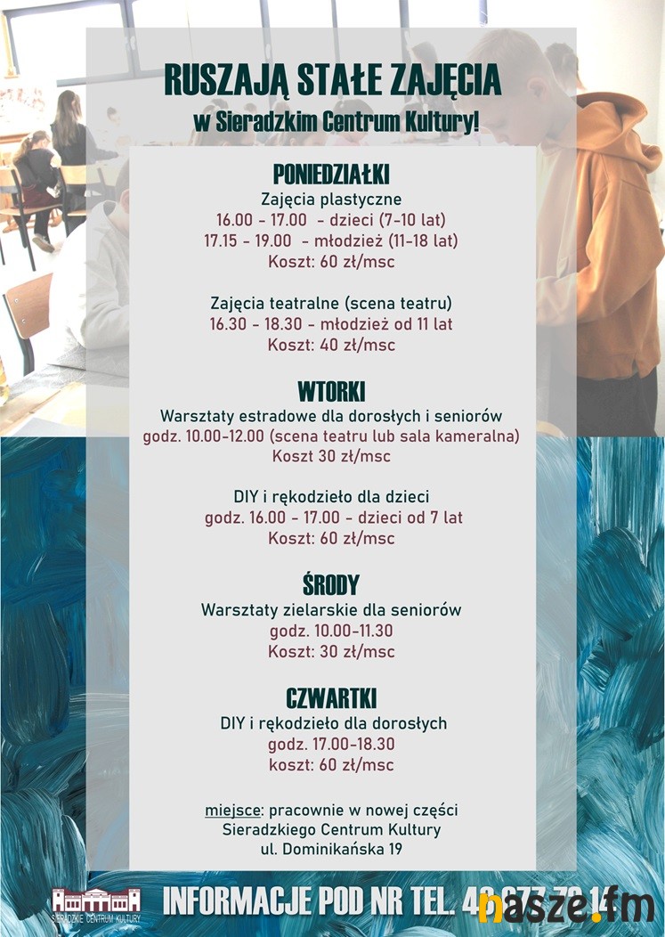 Stałe zajęcia artystyczne dla dzieci, młodzieży, dorosłych i seniorów wystartują już 14 kwietnia. Trwają zapisy na regularne warsztaty plastyczne, teatralne, rękodzielnicze dla dzieci i dorosłych, warsztaty zielarskie i estradowe dla seniorów. W planach są kolejne ciekawe zajęcia oraz wiele zajęć z rożnych dziedzin sztuki i nie tylko. W nowych pracowniach Sieradzkiego Centrum Kultury będzie można rozwijać swoje talenty, pasje i zainteresowania pod czujnym okiem wykwalifikowanych instruktorów. Prace uczestników warsztatów będą regularnie eksponowane w Sieradzkim Centrum Kultury, a efekty zajęć teatralnych i muzycznych będą prezentowane na teatralnej scenie Pracownicy Centrum zachęcają do tego, żeby się zapisywać. Można to robić dzwoniąc pod nr tel 43 677 72 14. Te zajęcia są odpłatne, ich koszt i terminy znajdziecie na plakacie poniżej.