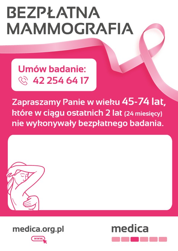 Rejestracja już ruszyła! Zapraszamy Panie w wieku od 45-74 lat, które przez ostatnie 2 lata ( 24 miesiące ) nie korzystały z bezpłatnego badania. Wystarczy zadzwonić pod numer: 42 254 64 17 i umówić się na konkretną godzinę. Liczba miejsc jest ograniczona.