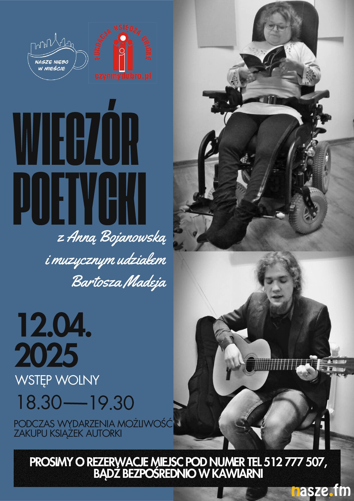Jutro, 12 kwietnia, w kawiarni Nasze Niebo w Mieście przy ul. Łaskiej 88 w Zduńskiej Woli odbędzie się wieczór poetycko-muzyczny, podczas którego wstąpią Anna Bojanowska i Bartosz Madej. Wydarzenie odbywa się w ramach dorocznego spotkania Fundacji Księdza Orione Czyńmy Dobro.