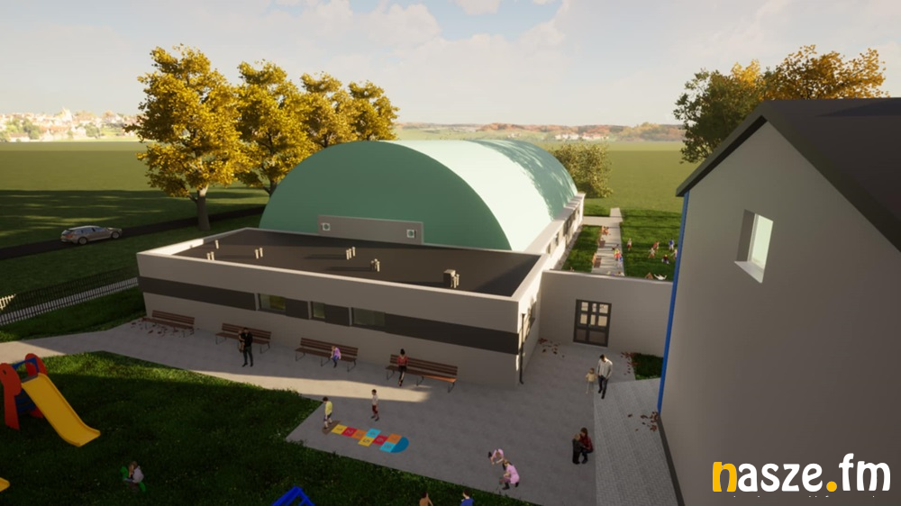 Projekt obejmuje budowę zadaszonego boiska z zapleczem sanitarno-szatniowym wraz z łącznikiem do budynku szkoły, oraz rozbudowę budynku szkoły o dodatkowe szatnie dla uczniów. Przewiduje się ponadto rozbudowę ciągów pieszych w sąsiedztwie istniejących i projektowych budynków. Ponadto przewiduje się utwardzenie z kostki betonowej pod 10 miejsc postojowych do budynku szkoły, oraz budowę wiaty rowerowej. Projektowana powierzchnia zabudowy wyniesie 925,6 m2.
