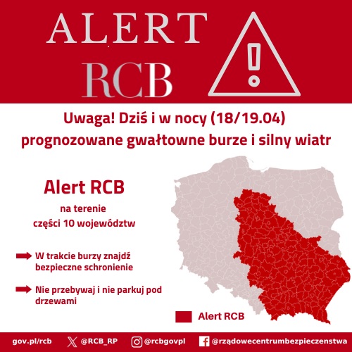 Przed prognozowanymi dla naszego regionu gwałtownymi burzami i silnym wiatrem ostrzega także Rządowe Centrum Bezpieczeństwa.