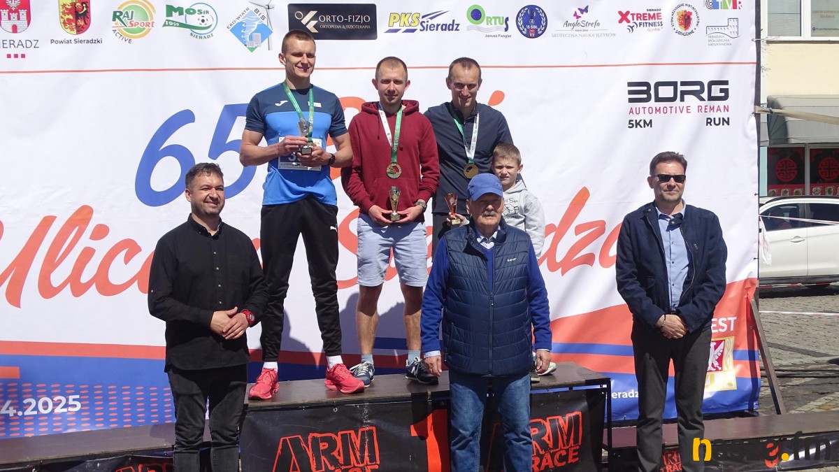 Na dystansie 5 km biegało 168 zawodników, a zwyciężył sieradzanin Mateusz Juchner – 15 min i 59 s. Przed rokiem wygrał 64. Biegi Ulicami Sieradza na 10 km. Teraz drugi był Kamil Rybus (Bocheń) – 16:30, a trzeci Piotr Dębski (Galewice) – 16:51.