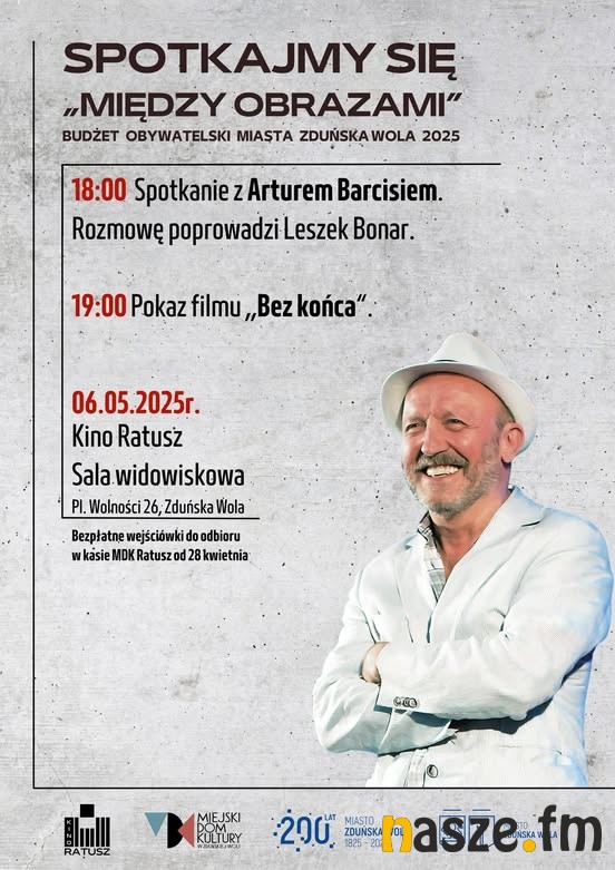 W ramach projektu "Spotkajmy się Między obrazami", który realizowany jest z Budżetu Obywatelskiego Zduńskiej Woli we wtorek, 6 maja o godz. 18:00 rozpocznie się spotkanie z Arturem Barcisiem, które poprowadzi Leszek Bonar. Po spotkaniu autorskim będzie można zobaczyć film "Bez końca".