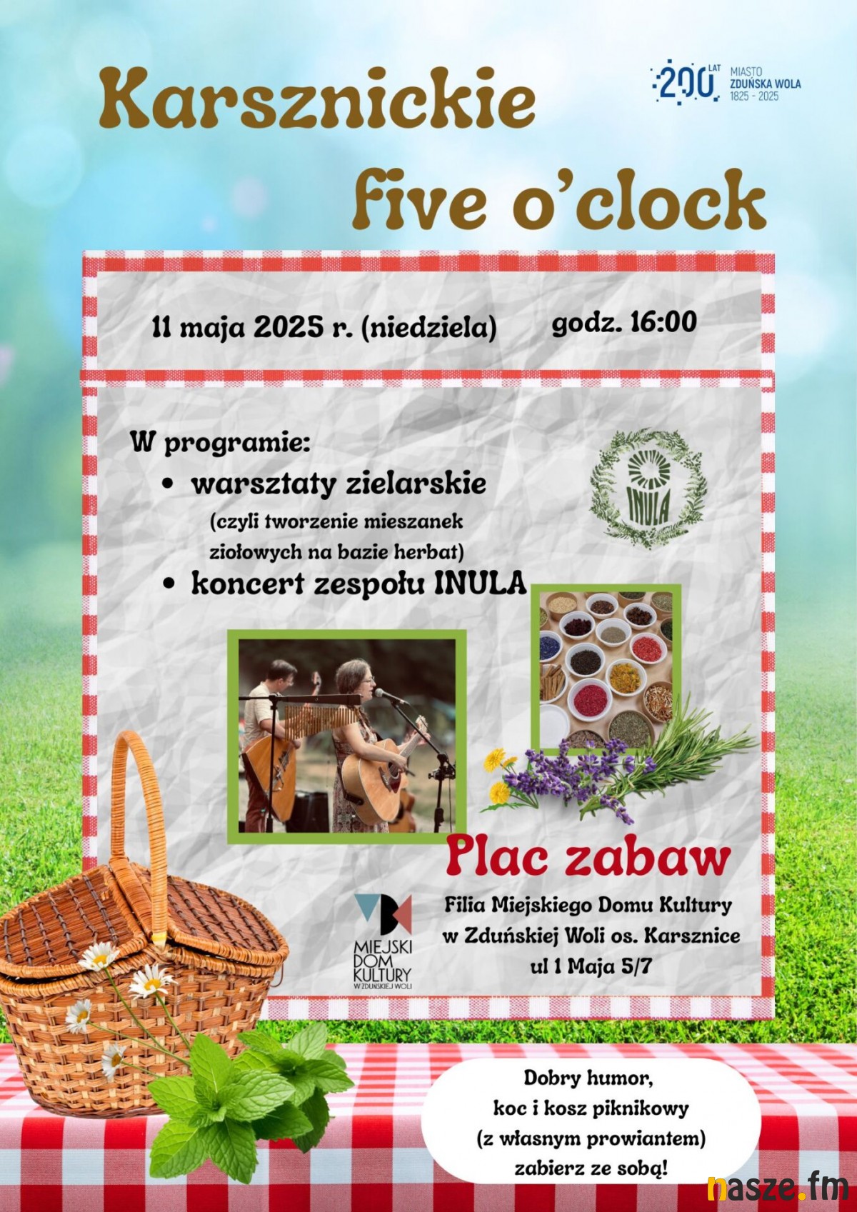 To będzie świetna okazja, by zatrzymać się na chwilę, odpocząć i poczuć zapach wiosennych ziół i magię muzyki granej na żywo - z pasją, sercem i mnóstwem instrumentów. "Karsznickie five o’clock" to wyjątkowe warsztaty i koncert w plenerze.