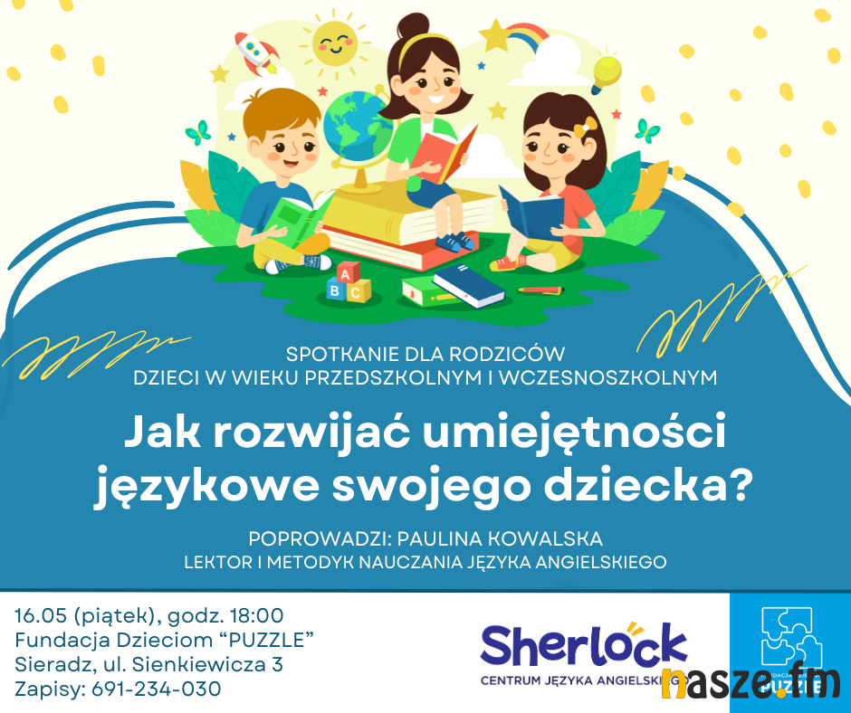 Fundacja Dzieciom "PUZZLE" z Sieradza zaprasza na spotkanie pt. "Jak rozwijać umiejętności językowe swojego dziecka". Wydarzenie odbędzie się w najbliższy piątek, 16 maja, w siedzibie fundacji.
