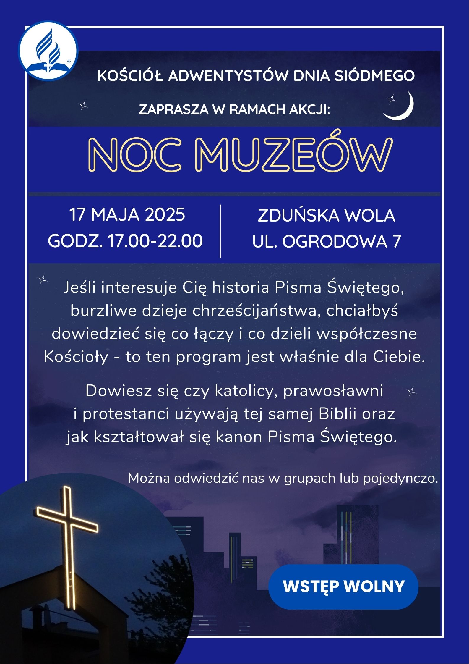 Jeśli interesuje Cię historia, burzliwe dzieje chrześcijaństwa, chciałbyś dowiedzieć się co łączy i co dzieli współczesne Kościoły - to ten program jest właśnie dla Ciebie. Dowiesz się czy katolicy, prawosławni i protestanci używają tej samej biblii oraz jak kształtował się kanon Pisma Świętego. Będzie to również okazja do zwiedzenia Kościoła Adwentystów Dnia Siódmego przy ul. Ogrodowej 7. Wszystko to w godz. 17:00-22:00.
