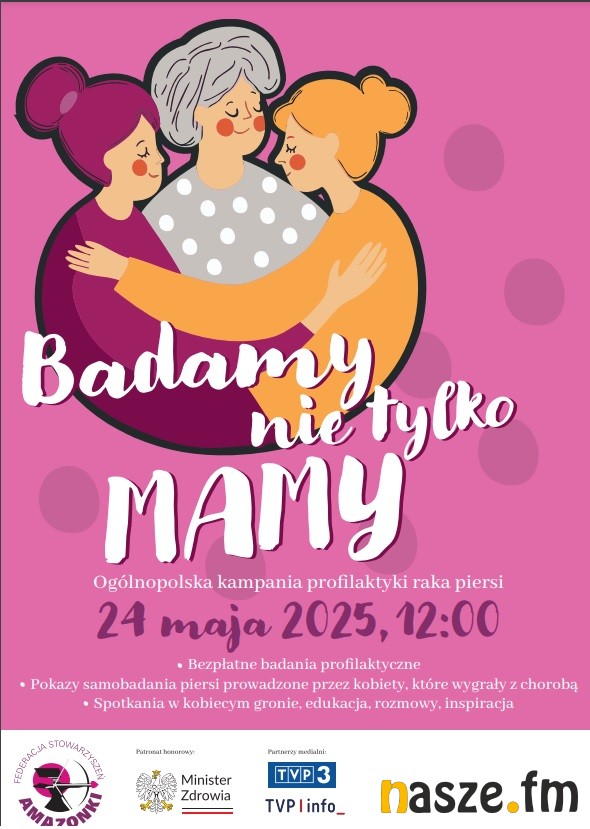 To tytuł ogólnopolskiej akcji, która w najbliższą sobotę zostanie też zorganizowana w Sieradzu. 24 maja w samo południe w całej Polsce z okazji Dnia Matki odbędzie się kampania profilaktyki raka piersi pod hasłem "Badamy nie tylko mamy". Członkinie Sieradzkiego Klubu Amazonka – jak wiele innych Klubów Amazonek w całej Polsce popierają pomysł edukacji kobiet i włączają się w tę akcję.