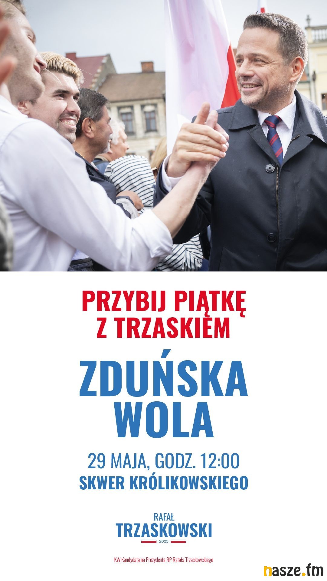 Na kampanijnej trasie przed II turą wyborów prezydenckich znalazła się Zduńska Wola. W czwartek, 29 maja, będzie można "Przybić piątkę z Trzaskiem" o 12:00. Organizatorzy zapraszają wszystkich sympatyków Rafała Trzaskowskiego.