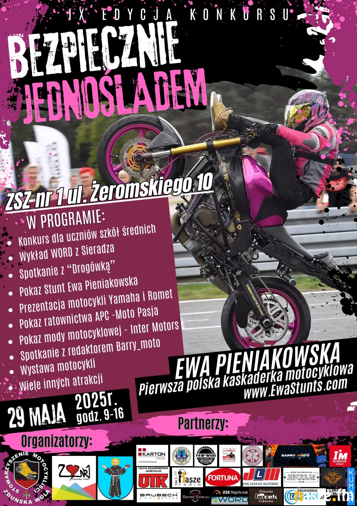 W programie m.in. pokaz udzielania pierwszej pomocy, konkurs o bezpieczeństwie, pokaz mody motocyklowej czy pokaz stuntu. Nie zabraknie również zaproszonych gości. Do Zduńskiej Woli przyjedzie Piotr "Barry" Baryła z Motogen oraz Ewa Pieniakowska, pierwsza polska kaskaderka motocyklowa .