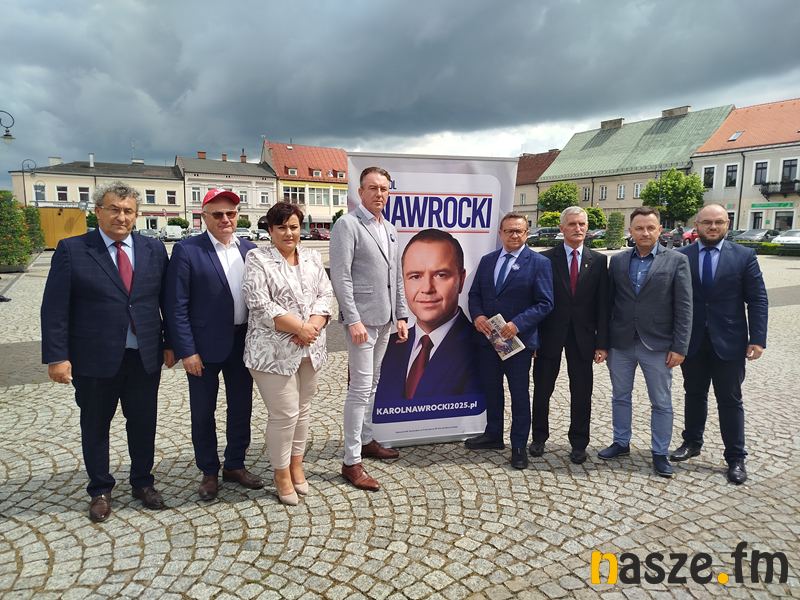 Przedstawiciele Prawa i Sprawiedliwości z konferencją prasową na Rynku w Sieradzu. Poprzez lokalne media przekonywali dziś, by w drugiej turze wyborów prezydenckich głosować na Karola Nawrockiego popieranego przez to ugrupowanie polityczne.