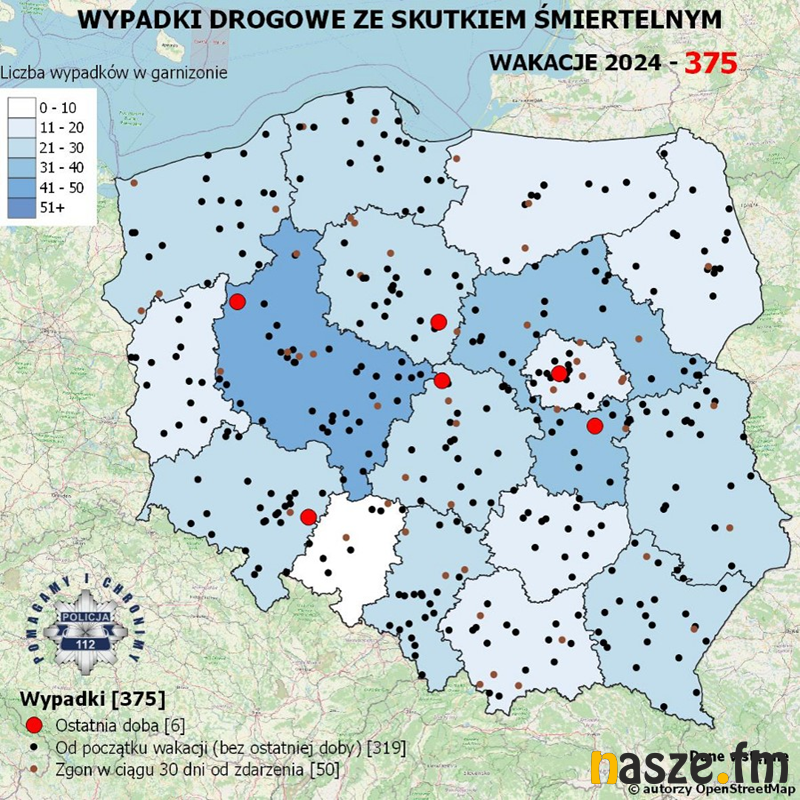 Dane dostępne na mapie dotyczącą wypadków w okresie wakacyjnym z podziałem na: