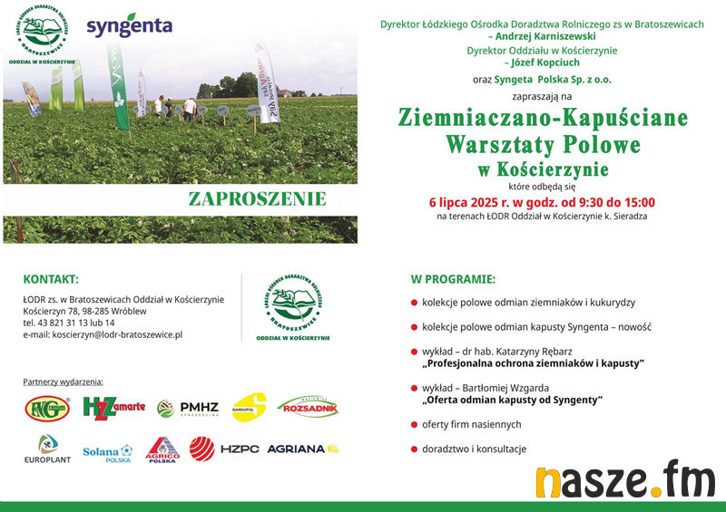 W programie m.in. kolekcje polowe odmian ziemniaków i kukurydzy, wykłady tematyczne oraz oferta firm nasiennych. Zainteresowani będą także mogli liczyć na doradztwo i konsultacje. Do swego oddziału w Kościerzynie zaprasza Łódzki Ośrodek Doradztwa Rolniczego w Bratoszewicach. Współorganizatorem warsztatów jest firma Syngenta Polska. Niedziela 9:30 - 15:00.