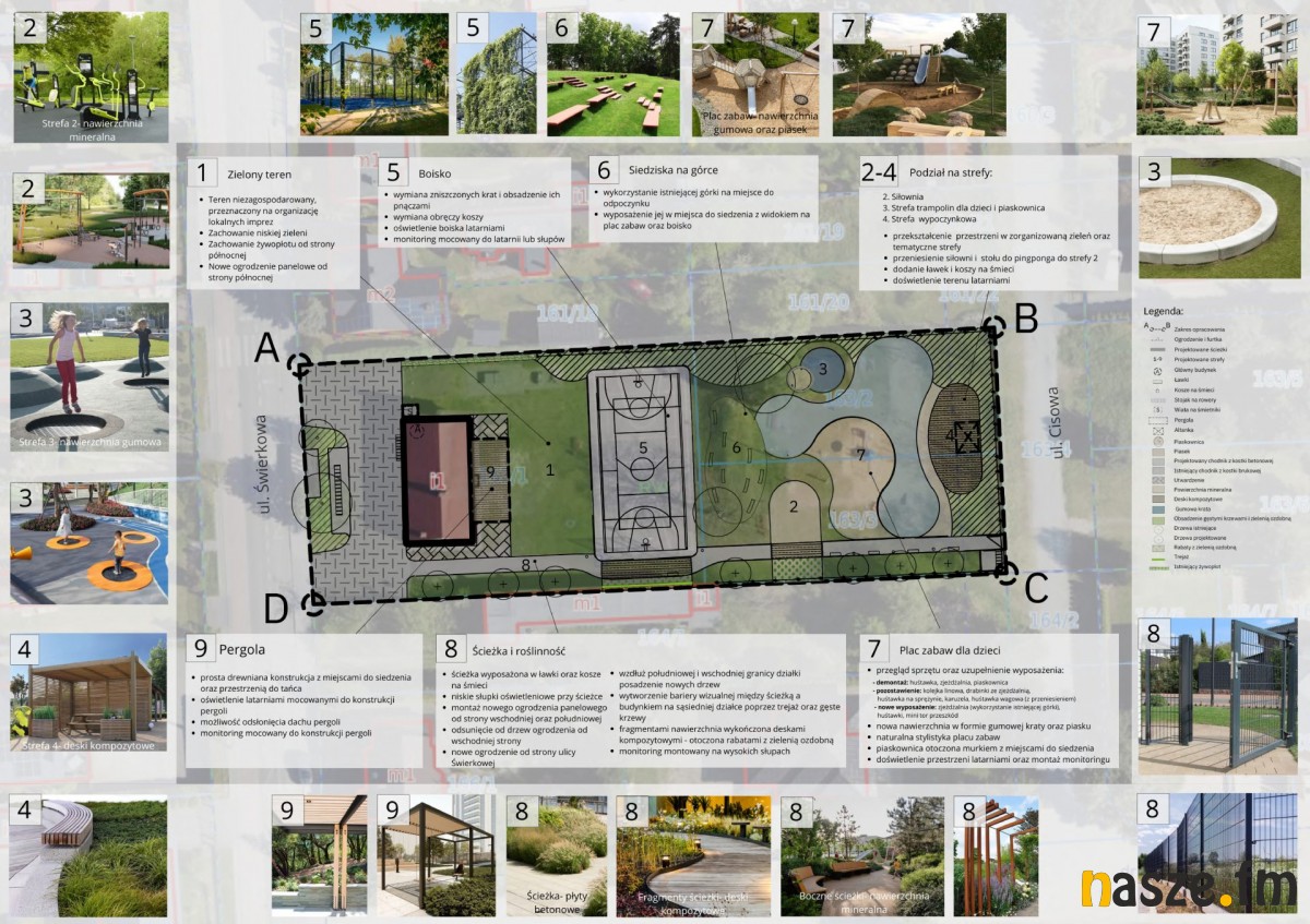 Projekt zakłada kompleksową rewitalizację terenów zielonych. Będą posadzone drzewa, krzewy, byliny oraz trawy ozdobne. Wytyczone zostaną alejki. Ustawione zostaną nowe ławki, kosze na śmieci, obudowy pojemników na odpady oraz nowa tablica ogłoszeniowa. Zaplanowano także budowę altany, która będzie pełnić funkcję miejsca odpoczynku. Ponadto powstanie nowoczesny plac zabaw wyposażony w zjeżdżalnię, huśtawkę oraz trampolinę. Odnowione zostanie również boisko do koszykówki, a stół do ping-ponga zostanie przeniesiony w nowe miejsce. Park kieszonkowy zostanie oświetlony oraz objęty monitoringiem.