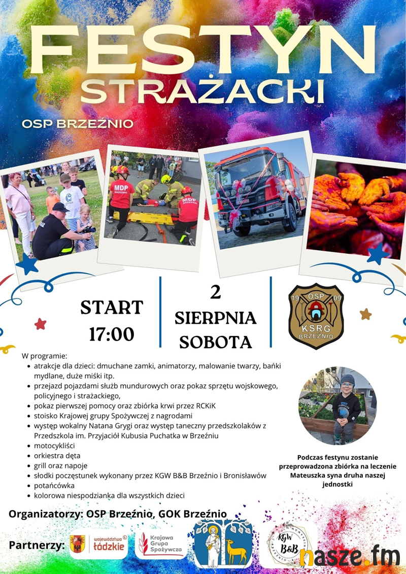 Ochotnicza Straż Pożarna w Brzeźniu (pow. sieradzki) wspólnie z miejscowym ośrodkiem kultury organizuje 02.08.br. festyn letni. Dochód z imprezy pójdzie na pomoc w ratowaniu zdrowia kilkuletniego Mateusza, syna jednego z miejscowych strażaków. Wydarzenie odbędzie się pod honorowym patronatem Joanny Skrzydlewskiej, marszałka województwa łódzkiego.