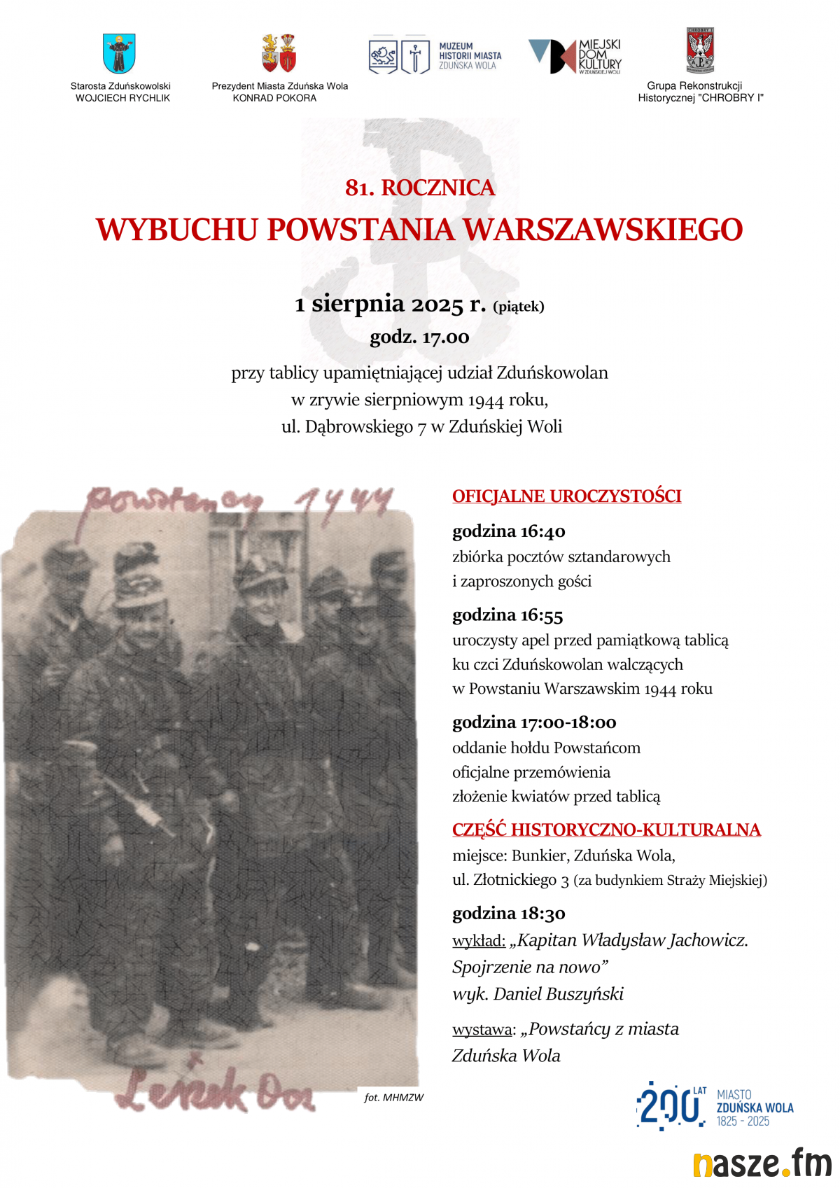 Druga część obchodów odbędzie się o godz. 18:30 w Bunkrze (ulica Stefana Złotnickiego 3) – tuż za budynkiem Straży Miejskiej. Historyk Daniel Buszyński wygłosi wykład pt. "Kapitan Władysław Jachowicz. Spojrzenie na nowo", poświęcony pochodzącemu ze Zduńskiej Woli dowódcy, który odegrał ważną rolę w czasie Powstania.