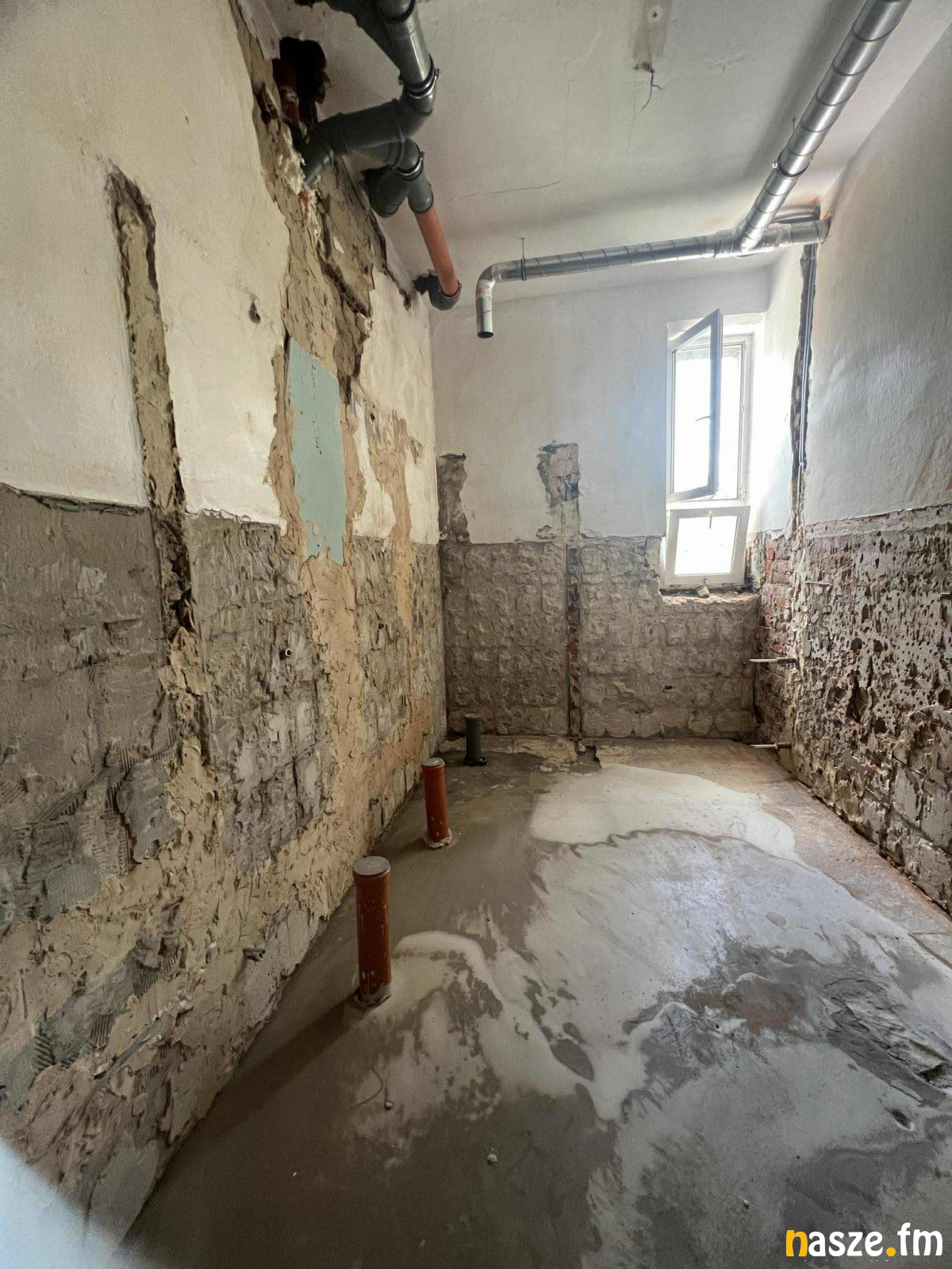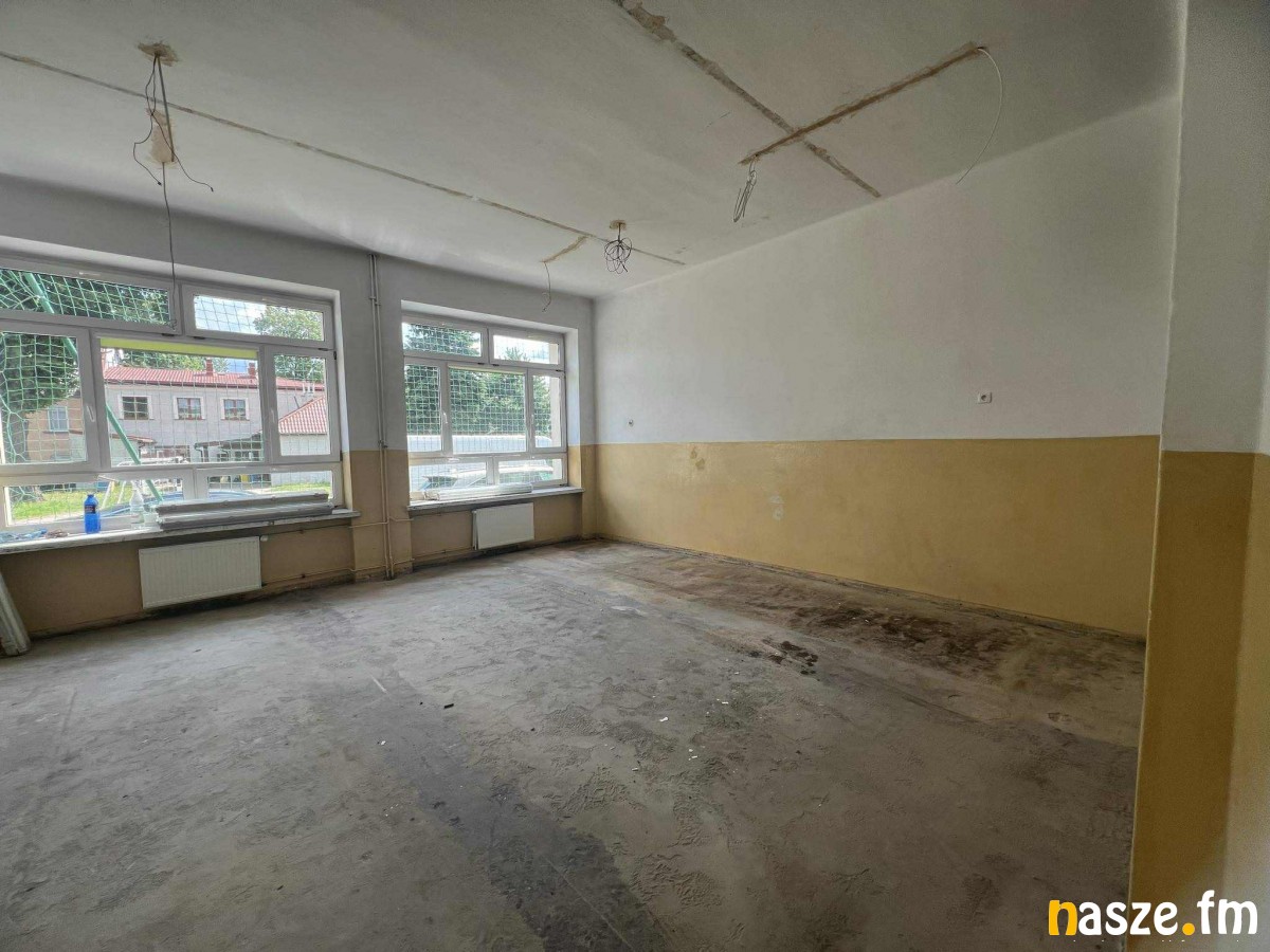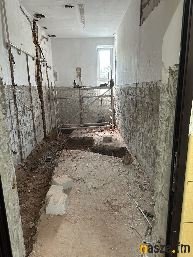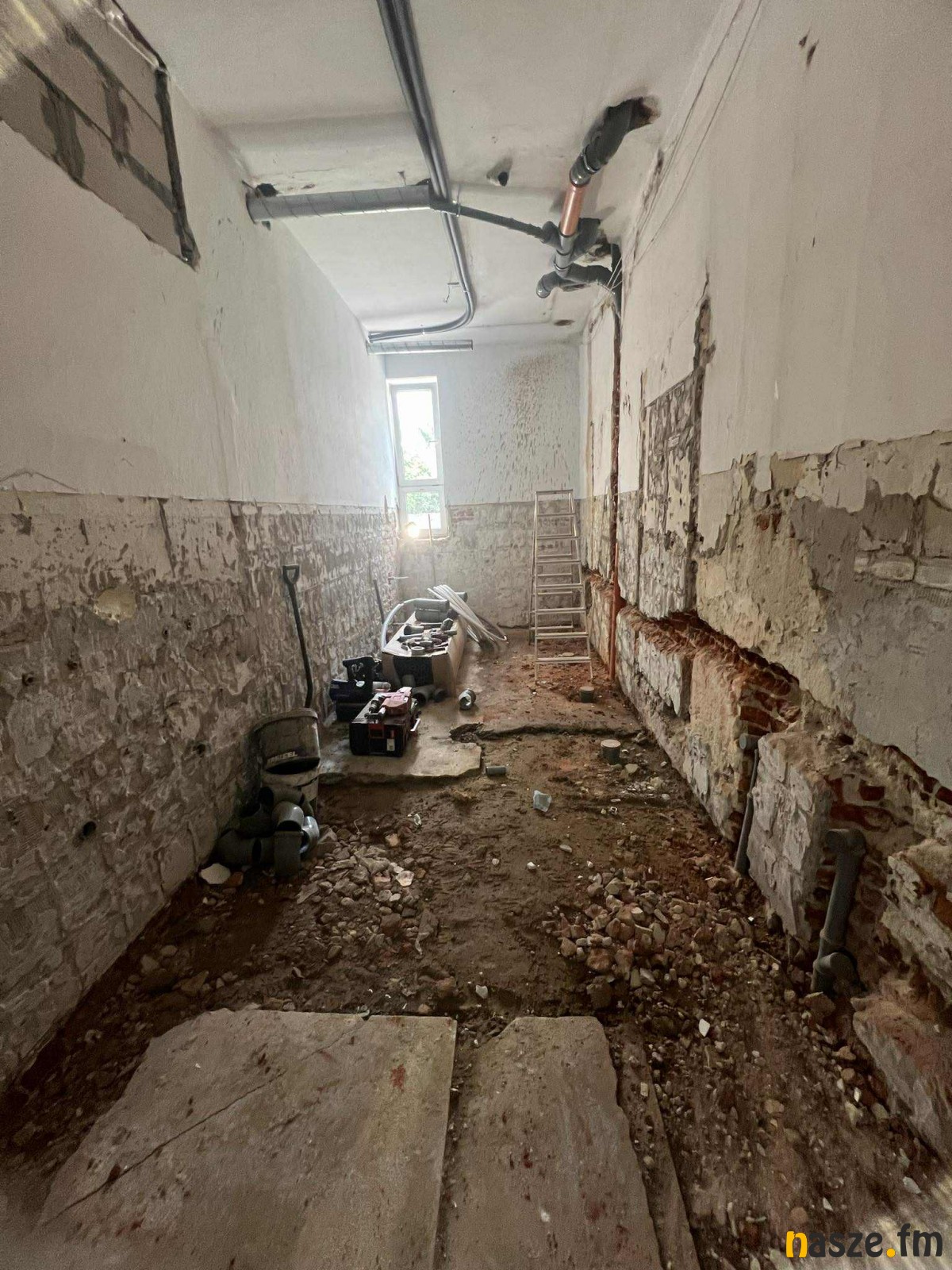 Aktualnie wykonano roboty demontażowe: skucie posadzek w pomieszczeniach objętych zakresem remontu, tj. w łazienkach na parterze, zapleczu kuchennym oraz salach lekcyjnych. Wymieniono instalacje sanitarne: przystąpiono do wymiany instalacji wodociągowej i kanalizacji sanitarnej w łazienkach na parterze, częściowo na piętrze oraz w zapleczu kuchennym.