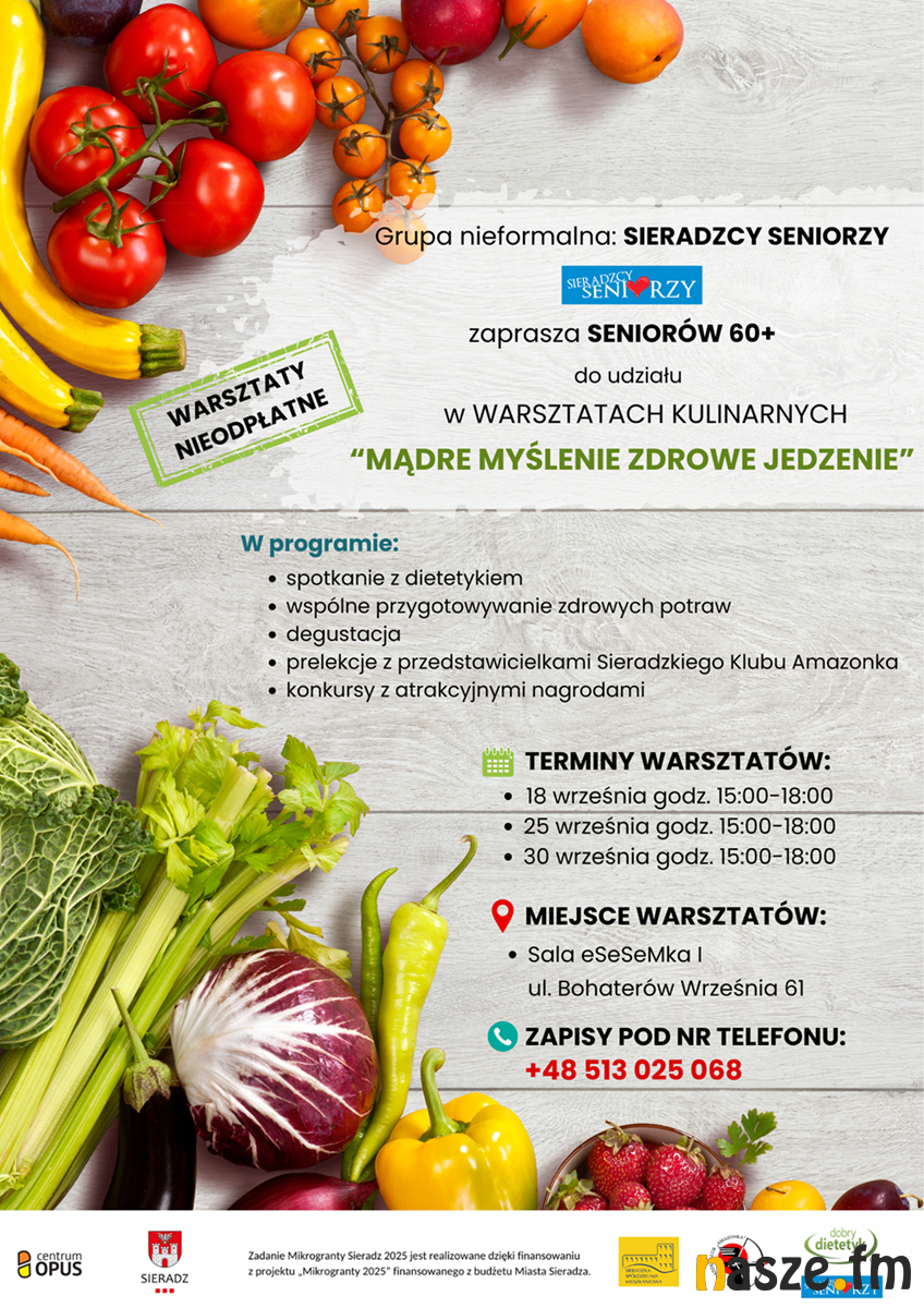 Sukces ubiegłorocznych warsztatów kulinarnych udowodnił, że wspólne gotowanie to nie tylko przepis na pyszne potrawy, ale przede wszystkim na radość, integrację i nowe przyjaźnie... Sieradzcy Seniorzy działający przy Sieradzkiej Spółdzielni Mieszkaniowej zapraszają na kolejną edycję warsztatów kulinarnych "Mądre myślenie zdrowe jedzenie" w ramach środków pozyskanych z programu realizowanego przez Miasto Sieradz i Centrum OPUS Mikrogranty Sieradz 2025.