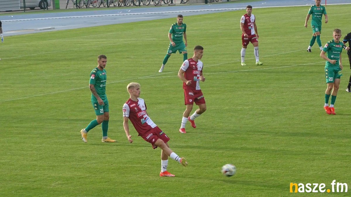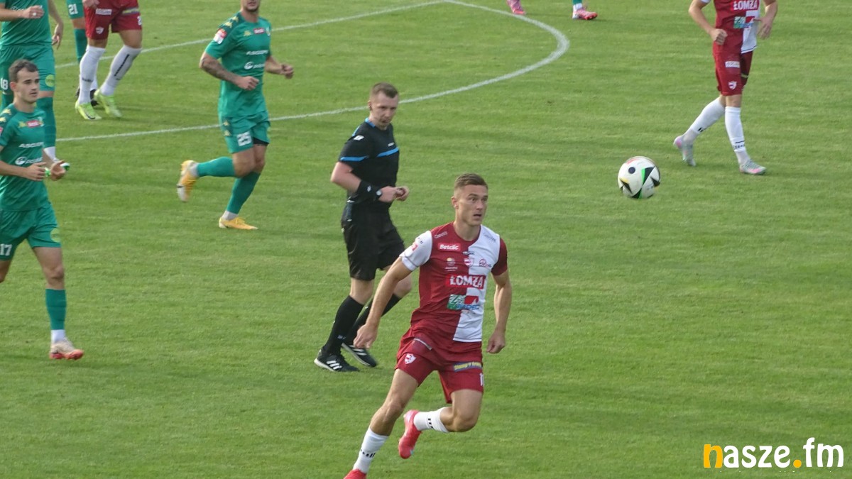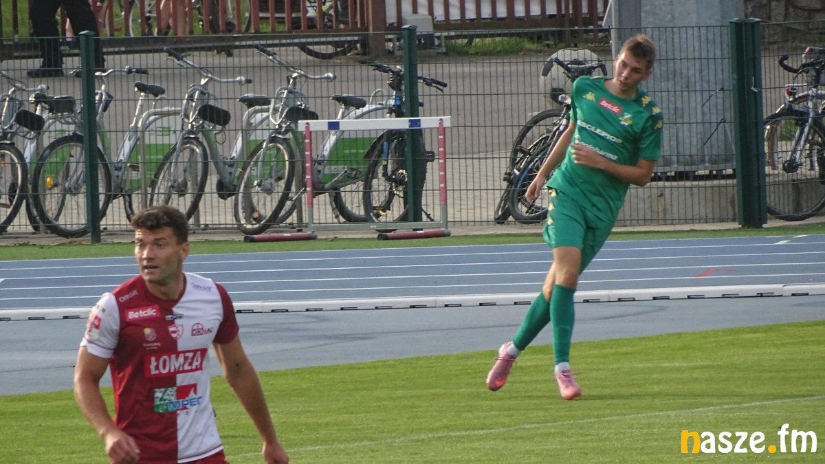 Goście dopięli swego w drugiej połowie. 61 minucie po zagraniu z prawej strony do pustej bramki trafił Patryk Zych. Trener Marek Przybył od razu zareagował decydując się na dwie zmiany. Z boiska zeszli: Drzazga i Jakub Piela, a pojawili się Jakub Janiszewski i Piotr Mielczarek, który po roku wrócił do drużyny Biało-Zielonych. Chwilę później sfaulowany w polu karnym został Damian Ślesicki. Sędzia odgwizdał jedenastkę, a rzut karny wykonał sam poszkodowany. Obrońca sieradzan pewnie uderzył i dał swojej drużynie bramkę wyrównującą. Niestety okazało się to za mało na zespół z Łomży. W 92 minucie piłkarz rywali uderzył z główki, Zelenskyi odbił piłkę, ale ta trafiła do Huberta Antkowiaka, który pewnie dobił ją do bramki.