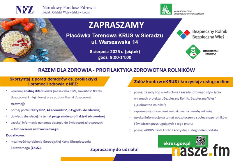 Oddział Regionalny Kasy Rolniczego Ubezpieczenia Społecznego w Łodzi zaprasza rolników i ich rodziny oraz osoby związane ze środowiskiem wiejskim na Dzień z NFZ i eKRUS, który zostanie zorganizowany w piątek 8 sierpnia 2025 r., w godzinach 10:00-14:00 w siedzibie Placówki Terenowej KRUS w Sieradzu przy ulicy Warszawskiej 14.
