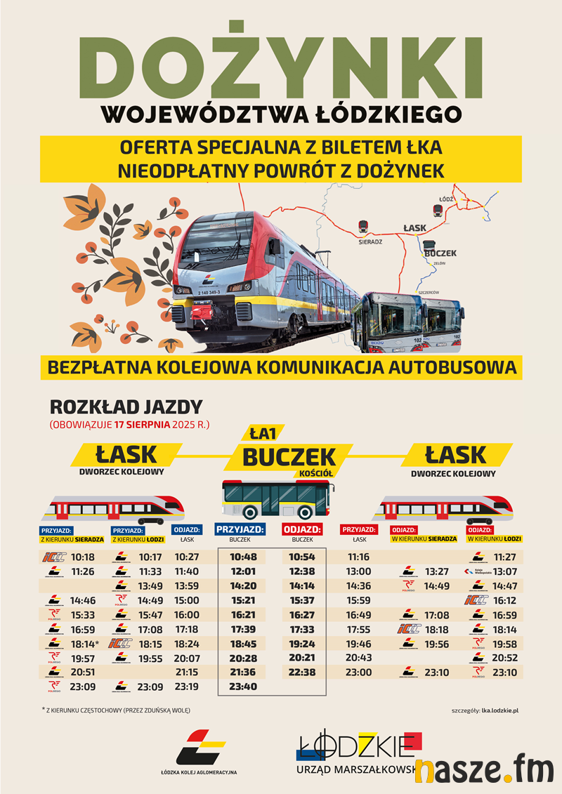 Łódzka Kolej Aglomeracyjna 17 sierpnia będzie świętować wraz z mieszkańcami. Ma specjalną propozycję dla wszystkich, którzy chcą wrócić z dożynek pociągiem. Tego dnia wystarczy kupić bilet jednorazowy ŁKA w jedną stronę do Łasku. Na jego podstawie będzie można skorzystać z bezpłatnego powrotu pociągiem ŁKA i POLREGIO oraz wybranymi pociągami PKP Intercity i Kolei Wielkopolskich w relacji odwrotnej do wskazanej na bilecie.