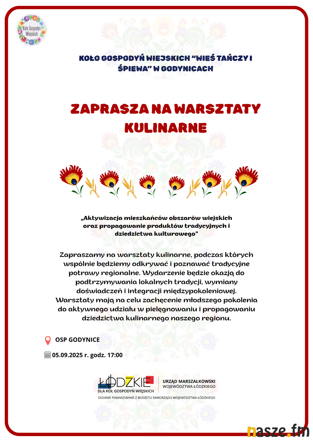 Koło Gospodyń Wiejskich "Wieś tańczy i śpiewa" w Godynicach (gmina Brąszewice) zaprasza na warsztaty kulinarne, podczas których wspólnie będzie można odkryć i poznać tradycyjne potrawy regionalne. Warsztaty odbędą się w najbliższy piątek.