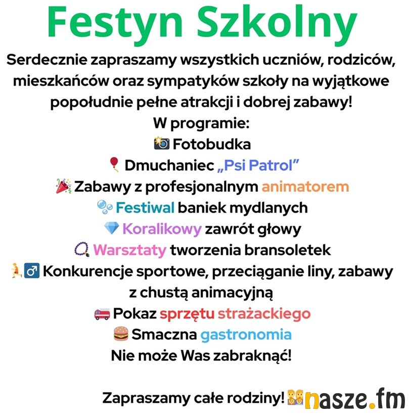 Festyn odbędzie się w godzinach 14.00-17.00. W programie wydarzenia: fotobudka, dmuchaniec "Psi Patrol", zabawy profesjonalnego animatora, festiwal baniek mydlanych, koralikowy zawrót głowy, warsztaty tworzenia bransoletek, konkurencje sportowe, przeciąganie liny, zabawy z chustą animacyjną, pokaz sprzętu strażackiego, smaczna gastronomia. Wstęp wolny.
