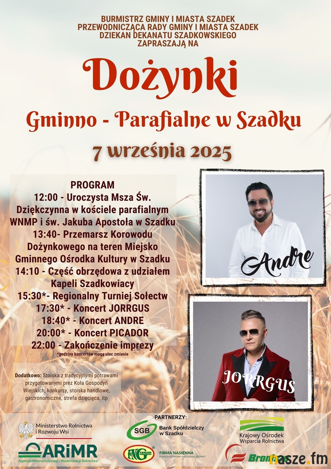 - 13:40- przemarsz korowodu dożynkowego na teren Miejsko-Gminnego Ośrodka Kultury w Szadku