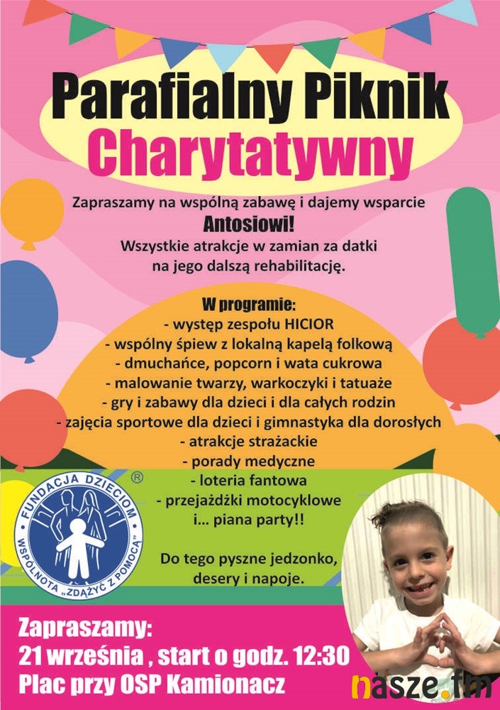 21 września na placu przy OSP Kamionacz odbędzie się Parafialny Piknik Charytatywny dla małego Antosia, który od urodzenia mierzy się z chorobą - wrodzoną wadą atrezji przełyku i niepełnosprawnością intelektualną w stopniu lekkim. Pieniądze zebrane podczas wydarzenia zostaną przekazane na rehabilitację Antosia.