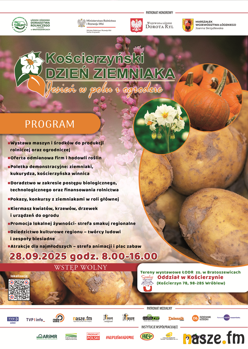 To kolejne wydarzenie plenerowe w regionie z wieloma atrakcjami. W Kościerzynie trwa kolejna edycja Kościerzyńskiego Dnia Ziemniaka - Jesień w Polu i Ogrodzie. Do podsieradzkiego Kościerzyna zaprasza oddział Wojewódzkiego Ośrodka Doradztwa Rolniczego w Bratoszewicach.