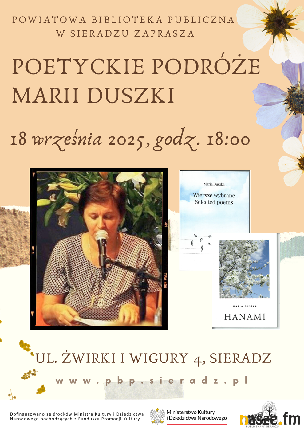 Powiatowa Biblioteka Publiczna w Sieradzu zaprasza dziś na godz. 18:00 na spotkanie z sieradzką poetką. - Będą wiersze i anegdoty z moich najnowszych tomików "Hanami" i "Wiersze wybrane / Selected poems". Zaprezentuję slajdy z podróży do Grazu, Lubeki, Hamburga, Wilna, Wodoktów, Poszawsza (Witkiewiczów), Iłgowa (Młynarskich), Góry Krzyży, Ejszyszek, Sołecznik itp. - zapowiada Maria Duszka.