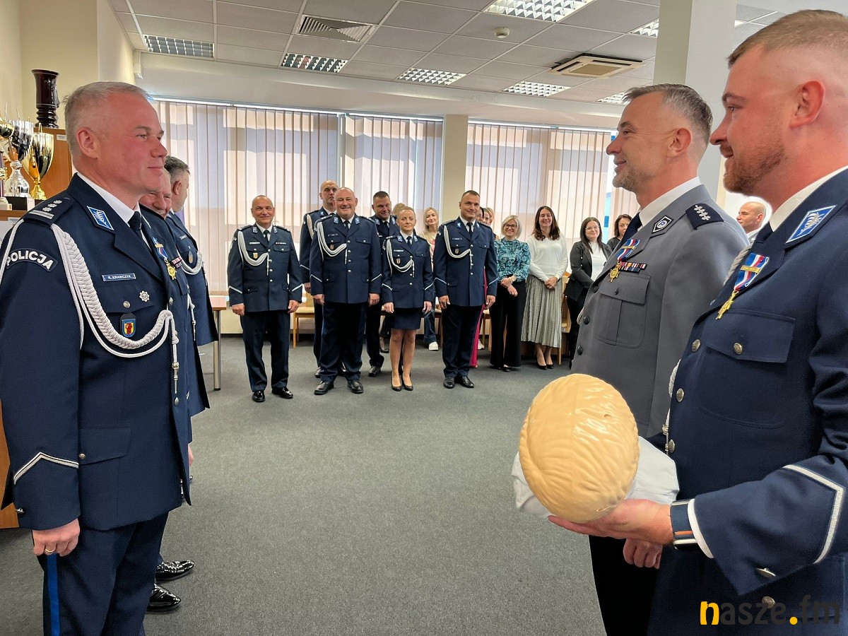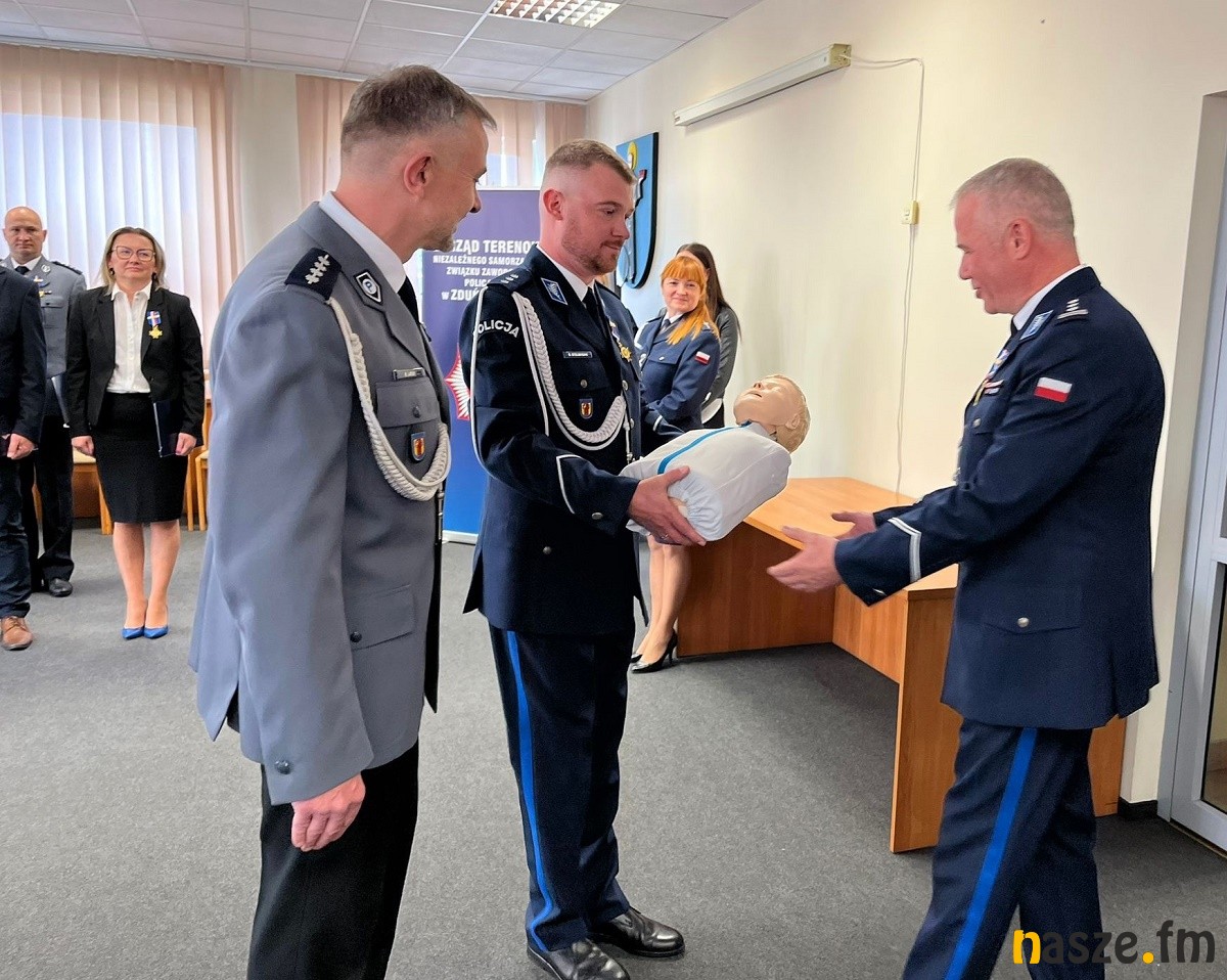 Ostatnim punktem uroczystości było wręczenie inspektorowi Robertowi Krawczykowi szkoleniowego defibrylatora AED oraz zestawu fantomów, tzw. "rodzinki". Sprzęt szkoleniowy wręczyli aspirat sztabowy Robert Latus, przewodniczący Zarządu Terenowego NSZZP w Zduńskiej Woli, a także jego zastępca komisarz Bartosz Stelmasiak. Sprzęt szkoleniowy został kupiony przez ZT NSZZP w Zduńskiej Woli. Pieniądze zostały pozyskane z funduszu prewencyjnego PZU w kwocie ponad 6 tys. zł.