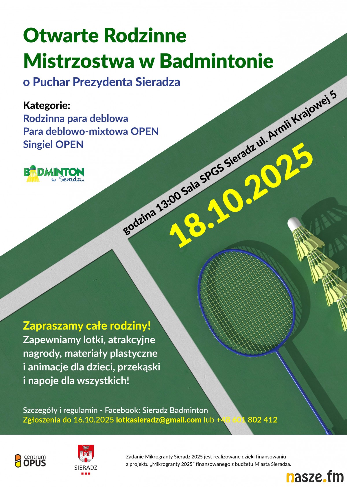 W sobotę w hali Szkoły Podstawowej Gminy Sieradz odbędą się Otwarte Rodzinne Mistrzostwa w Badmintonie o Puchar Prezydenta Sieradza. Zapisy trwają do czwartku.